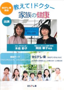 テレビ出演のお知らせ お知らせ 2025.09.28 当院の岡田華子副院長がBSテレ東「教えて!ドクター 家族の健康」(毎週土曜日20時54分~21時00分)の撮影に参加してきました。 放送は11月8日土曜20時54分~21時00分です。