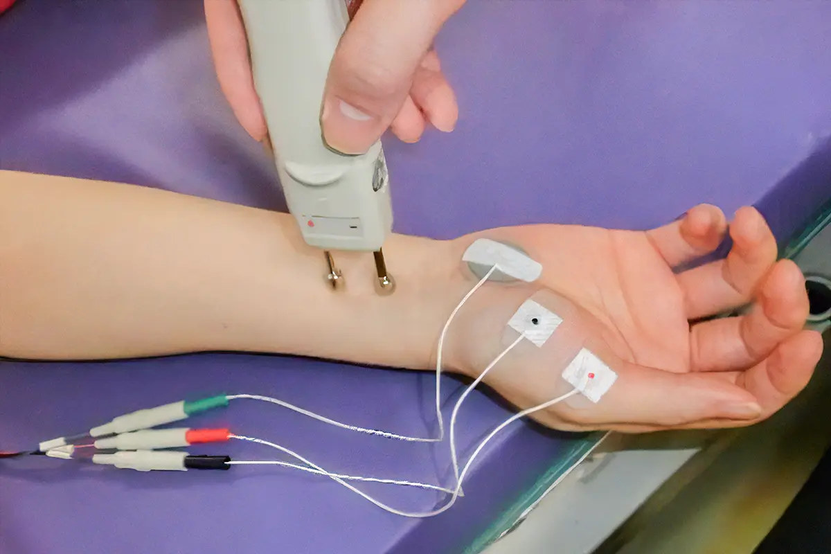 手足の痛みやしびれは、末梢神経の異常によって起こることがあります。当院では末梢神経の状態を調べるために神経伝導検査を行っています。