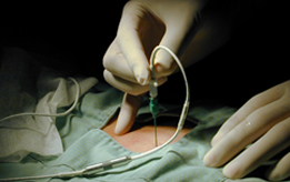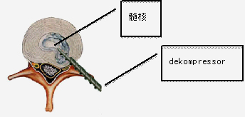 経皮的髄核摘出術には、stryker製のdekompressorを使用しています。Dekompressorの先端はドリル状のアルキメデス・ポンプ様構造となっていまして、これで髄核を摘出します。 髄核を摘出することで、椎間板ヘルニアの圧力を下げて神経への圧迫を取り除きます。傷は直径1.5mmの針穴のみで、低侵襲といえます。特徴は、手技料および健康保険が適応されることです。