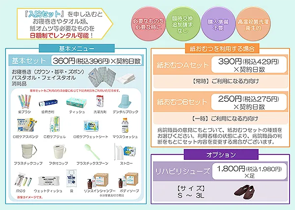入院中の病・タオル類・日用品・おむつなどの衛生材料につきましては、感染予防対策及び患者様のサービス向上のため、入院セットを導入しています。